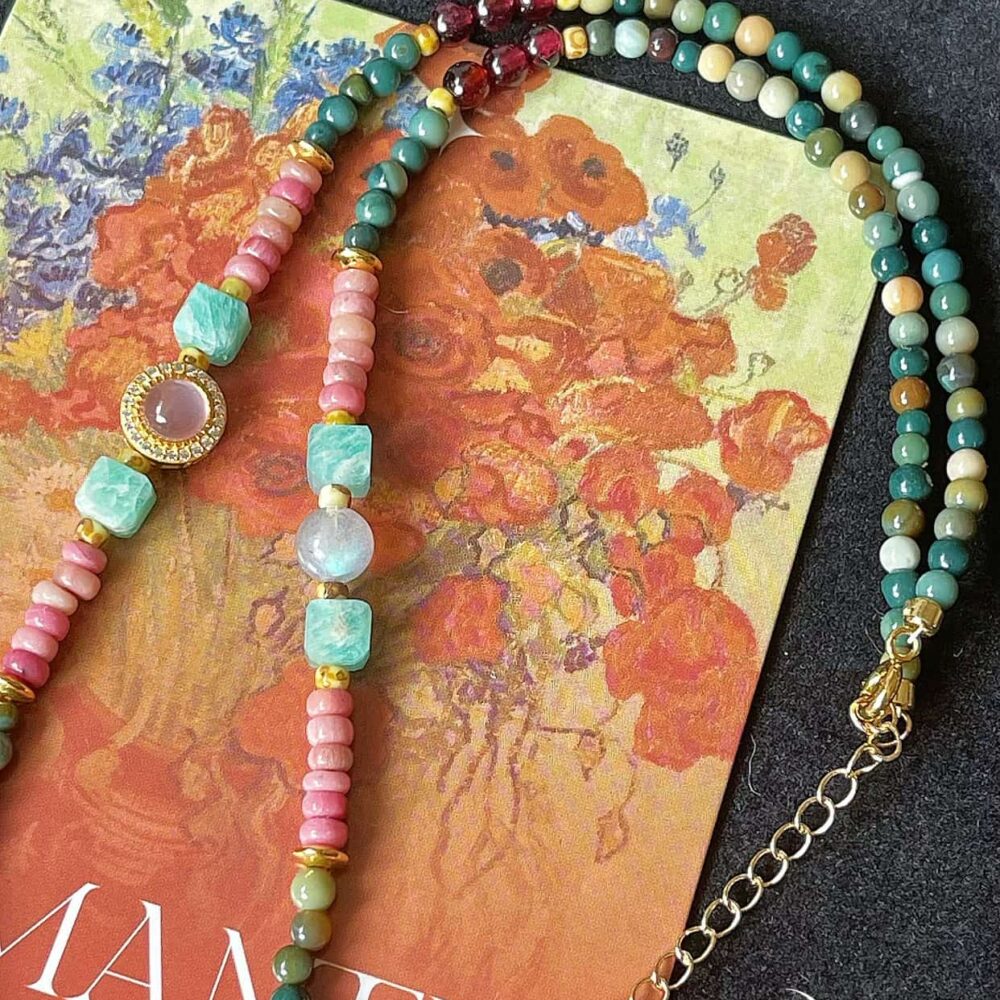 Materials: Alashan Agate, Amazonite,Rhodochrosite,Nanjiang red agate,Moonstone,Garnet,Calaite.